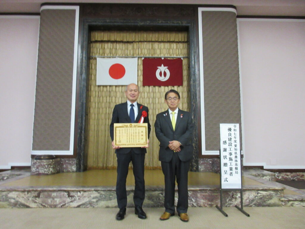 「令和7年度 愛知県建設局、都市・交通局、建築局優良工事施工業者感謝状贈呈式」において優良工事施工業者として感謝状を頂きました。