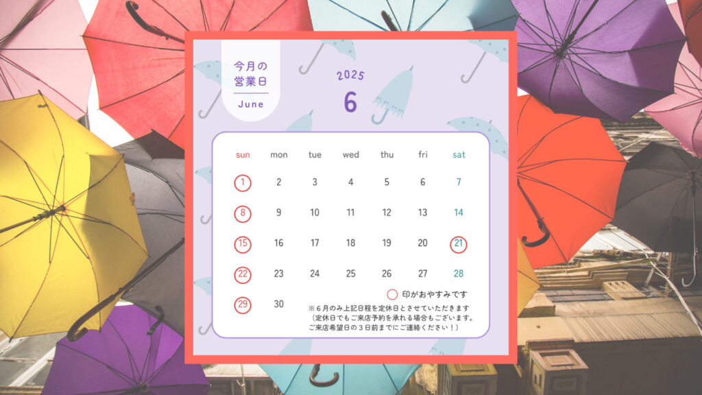 会社都合により、6月のみ定休日を土・日曜日とさせていただきます。